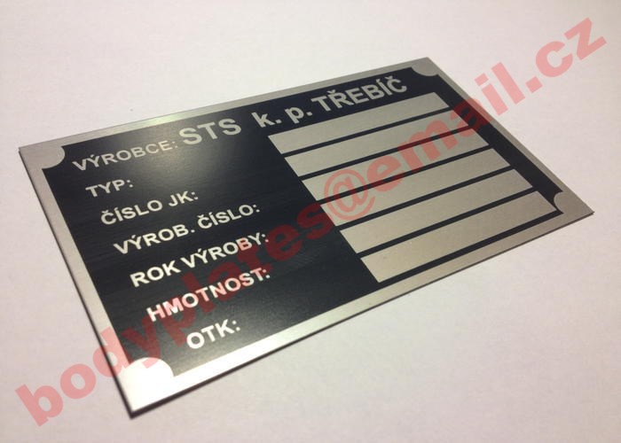 Výrobní štítek s hliníkovým podkladem, včetně děr pro připevnění (zde záleží na typu štítku, lepené štítky otvory nemají).