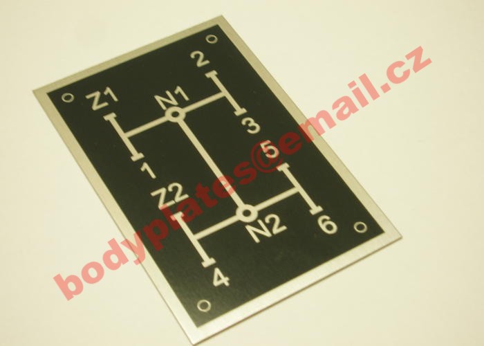 Datový štítek s hliníkovým podkladem, včetně děr pro připevnění (zde záleží na typu štítku, lepené štítky otvory nemají).